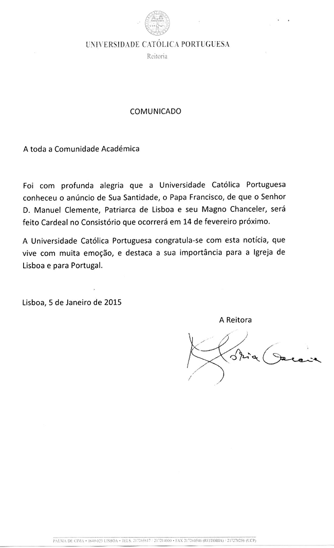 Comunicado da Senhora Reitora, Professora Doutora Maria Glória Garcia