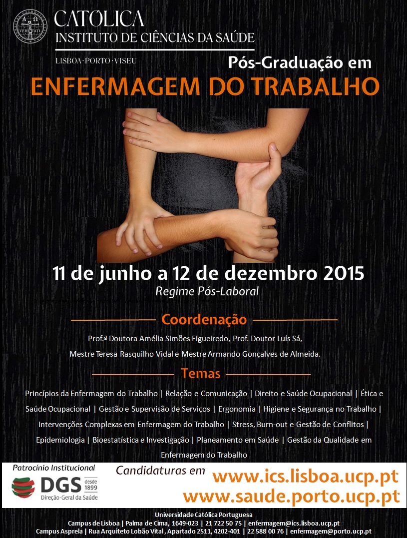 A Pós-Graduação em Enfermagem do Trabalho proposta pelo Instituto de Ciências da Saúde (UCP) tanto no Porto como em Lisboa recebeu o Patrocínio Institucional da Direção Geral da Saúde. Este apoio representa a distinção da inovação e da aplicabilidade desta proposta às necessidades dos Enfermeiros em Portugal.